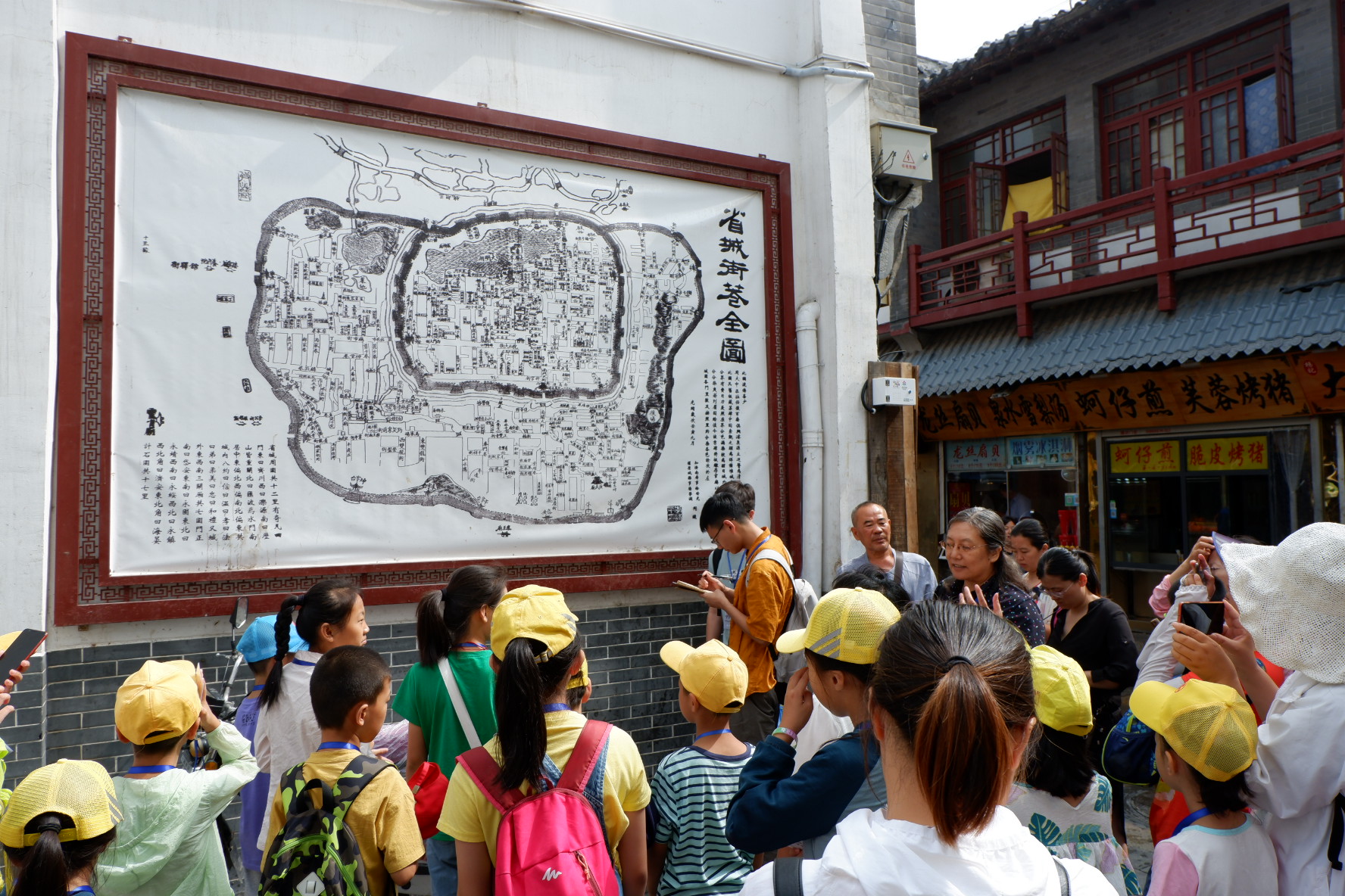 上午9时,济南市博物馆负责人颜咏梅,实践领队、云顶12300vip建筑学系副教授谷健辉,实践团队队长王钰林,队员宋文豪、贾欢欣在芙蓉街南门牌楼处同参与活动的孩子们集合完毕,研学之旅正式开始。步行于芙蓉街中,谷健辉向大家详细介绍了临街建筑的特征,从飞檐翘角的传统到拱券的结构运用,再到精美的壁画,一些细致入微、不易被人关注的知识,诸如石地板的排布方式、窗户上的花纹形式、建筑彩绘的色彩组成及比例,谷健辉都为孩子们娓娓道来。借助济南老地图,芙蓉街的前世今生和周边街道的肌理一一呈现在孩子们面前。在曲水亭街,谷健辉着重讲解普及了济南泉文化以及构成济南特色街道的冷泉系统。在“家家泉水,户户杨柳”的街区中,济南独特的人居环境对人的影响,古建筑、街巷的文化价值,深入每位活动参与者的心中。活动过程中,云顶12300vip团队的助教还对孩子们的听课效果进行了检测性提问。大家积极参与互动问答,气氛热烈。答对题目的孩子们都获得了老师们准备的小礼品,收获颇丰。